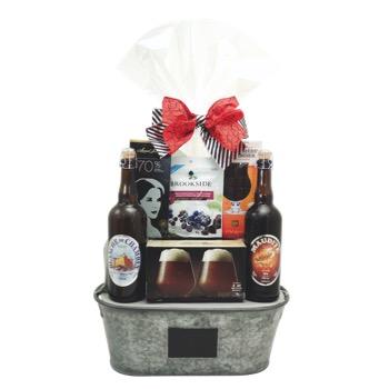 Le panier comprend: 2bières UNIBROUE, 2 verres à bière, 1 barre de chocolat LAURA SECORD, 1 barre de chocolat ROCHEF CHOCOLATIER et 1 sac de chocolat BROOKSIDE.