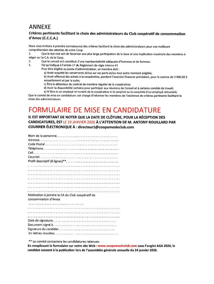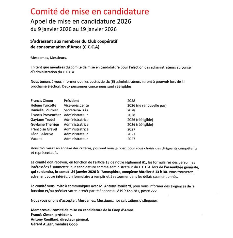 Le comité doit recevoir, en fonction de l'article 18 de notre règlement #1, les formulaires des personnes intéressées à soumettre leur candidature comme administrateur de C.C.C.A., lors de l'assemblée générale, qui se triendra, le samedi 24 janvier 2026 à l'Amosphère, complexe hôtelier à 13h30.